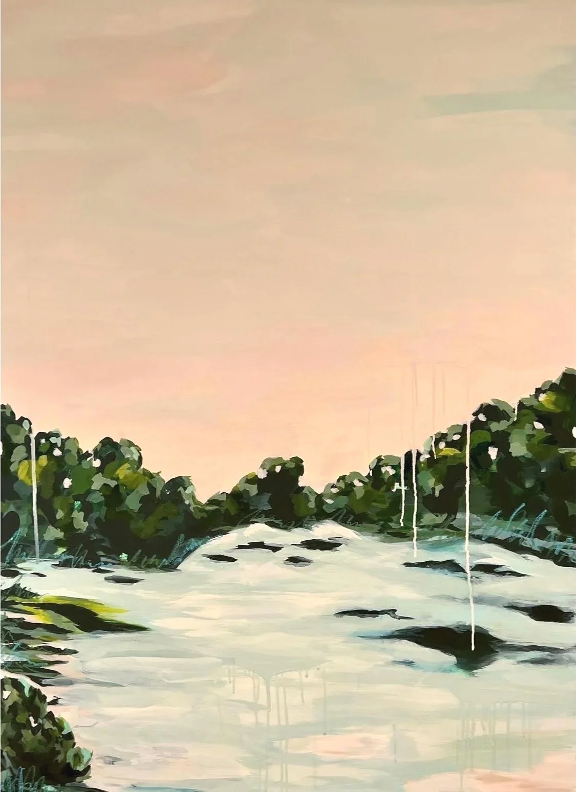 When I started painting in 2017, my imagination was captured and passion ignited by exploring and creating abstract techniques. Everything shifted in 2022 after moving into our historic home on the river. My studio is meant to be a sunroom- full of windows overlooking the river. There was simply no way that I could look at that view every day and not try to find a way to replicate it in my voice. I started integrating my favorite abstract painting techniques into river scenes and never looked back. Pictured here is the first Moon River piece: Moon River Dawn.